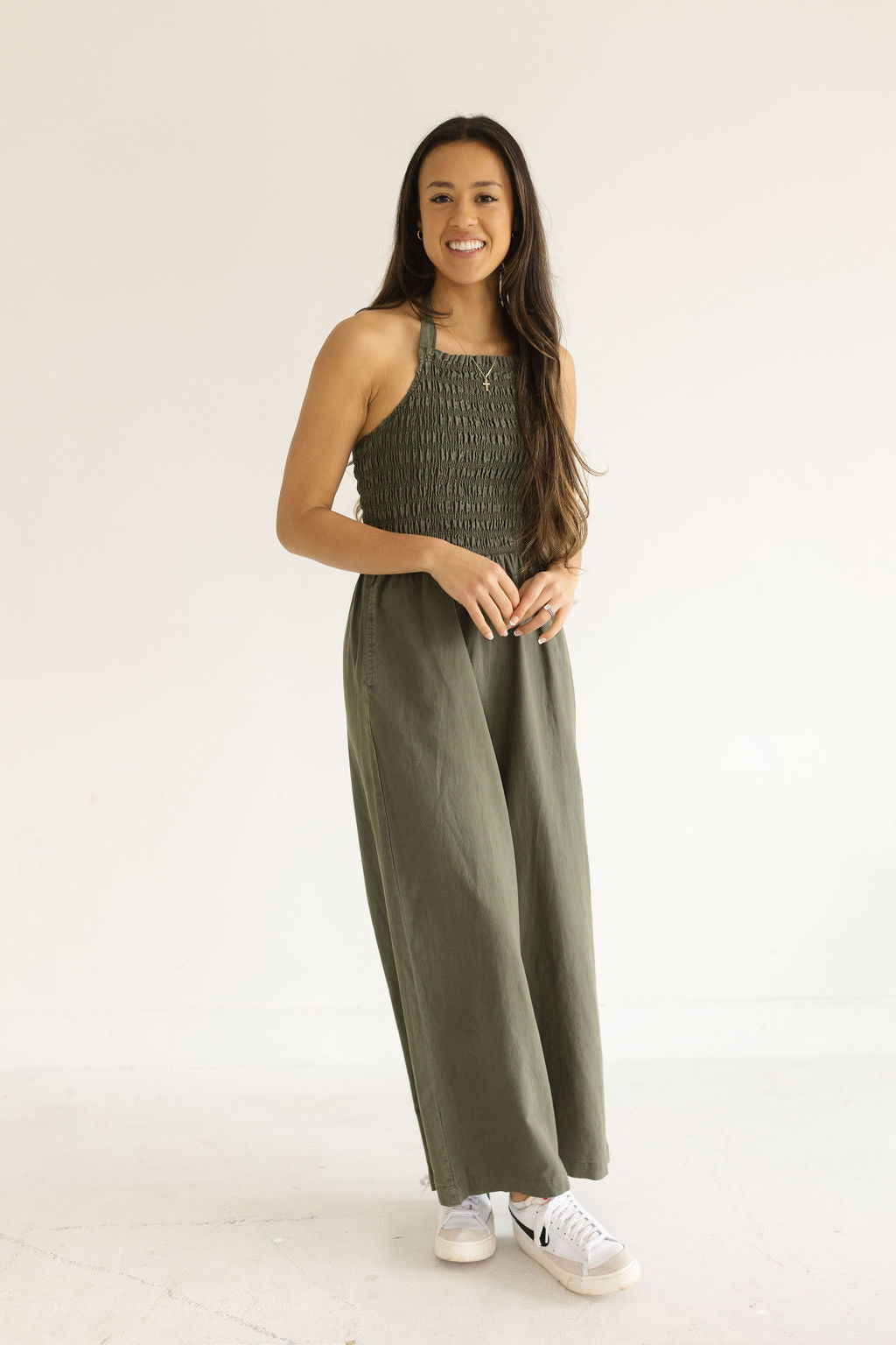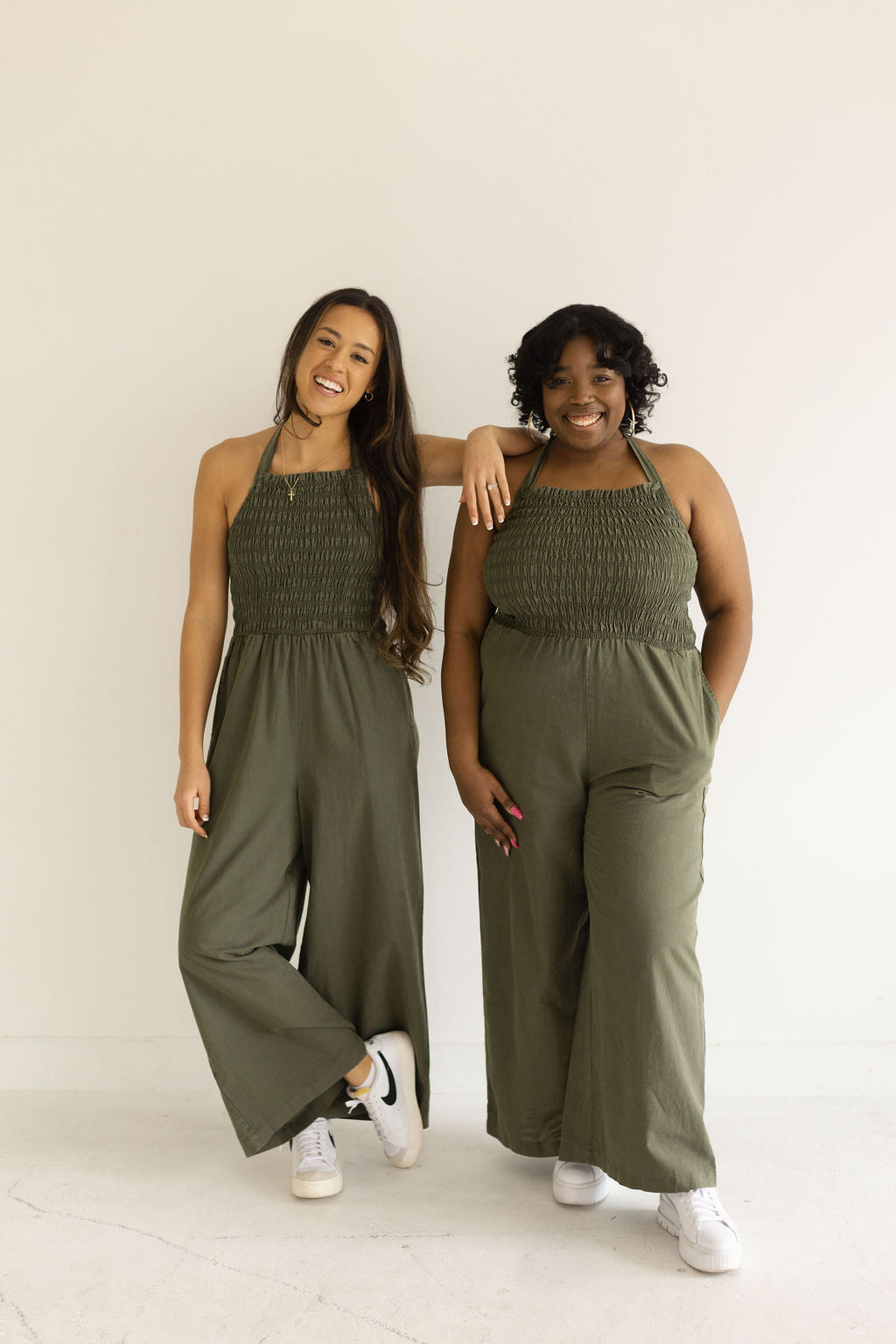Our Ruth Wide Leg Jumpsuit will leave you feeling comfortable and confident all at the same time. Pair with your favorite sneakers or a pair of slides. Our models are pictured wearing a size small and a size large.