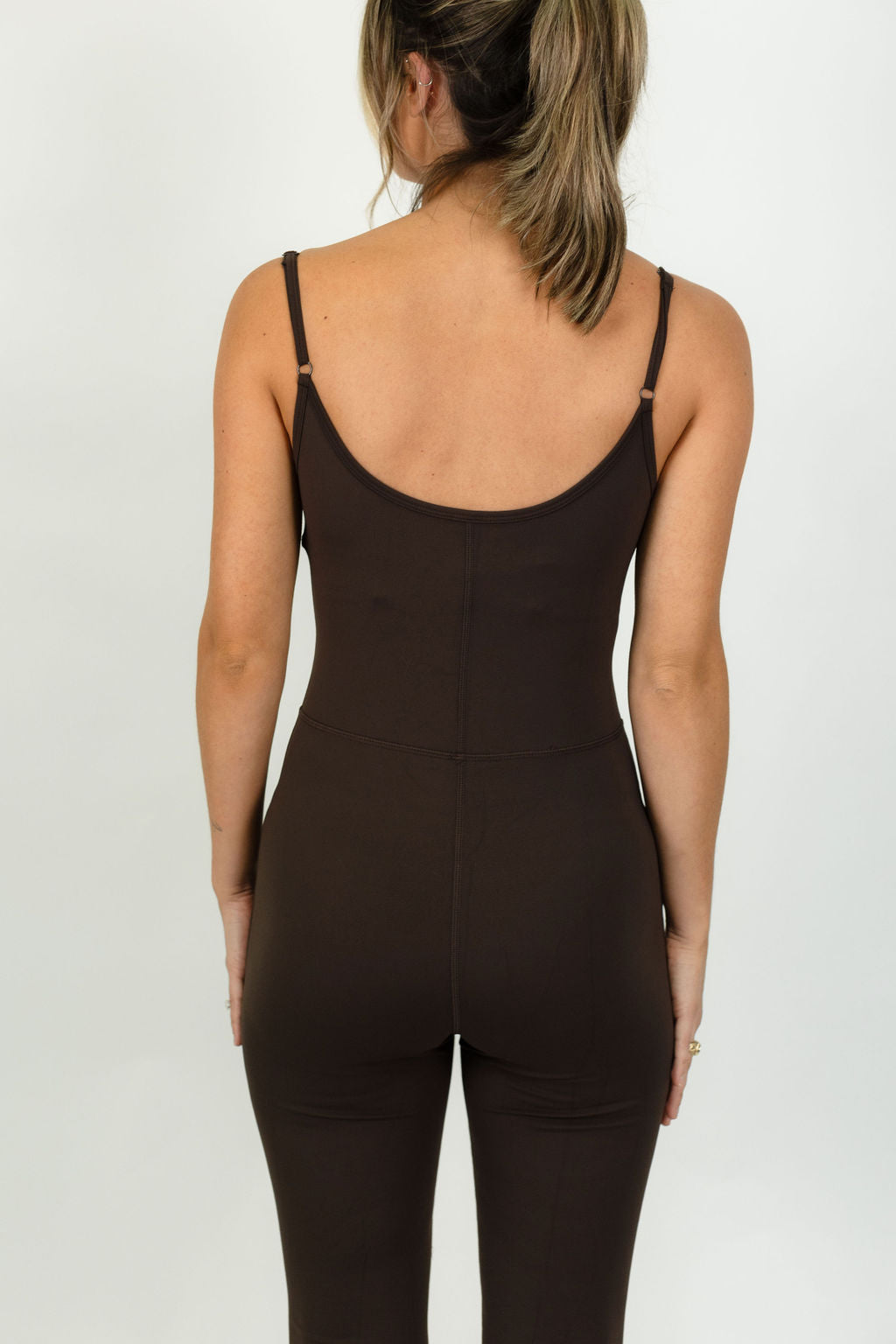 This sleeveless flare jumpsuit offers a modest option with complementing athletic knit fabric to support. It features adjustable straps, a scoop neck, and flare legs. Pair it with our Rylee Dark Chocolate Puffer Jacket for the cutest fall look. Our model is wearing a size small.