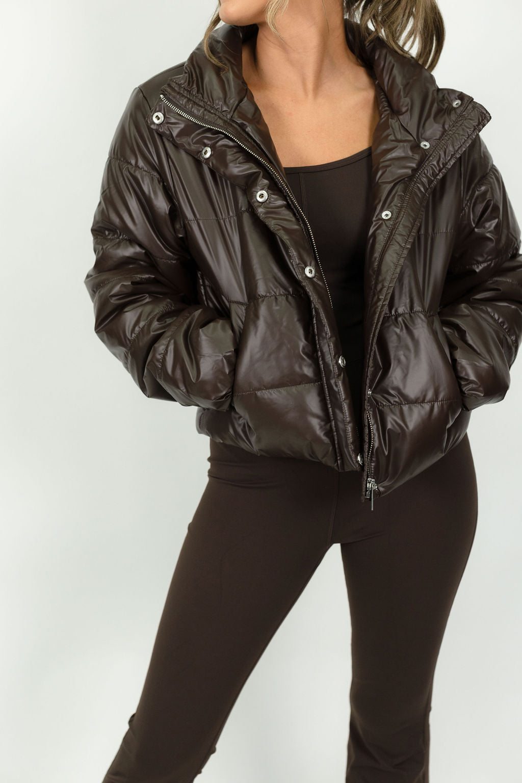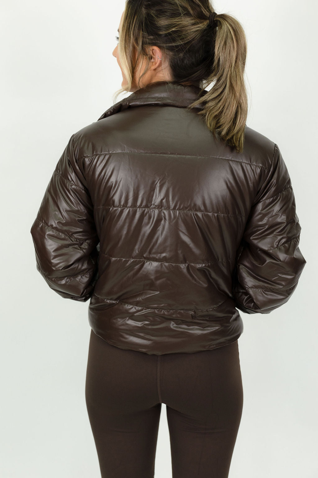 Our Rylee Dark Chocolate Puffer Jacket has a cropped fit and is perfect for running errands in your cozy clothes or throwing over your favorite gym outfit. This jacket features pockets and buttons from the neckline to the waist. Pair with our Rylee Dark Chocolate Jumpsuit. Model is wearing a size small.