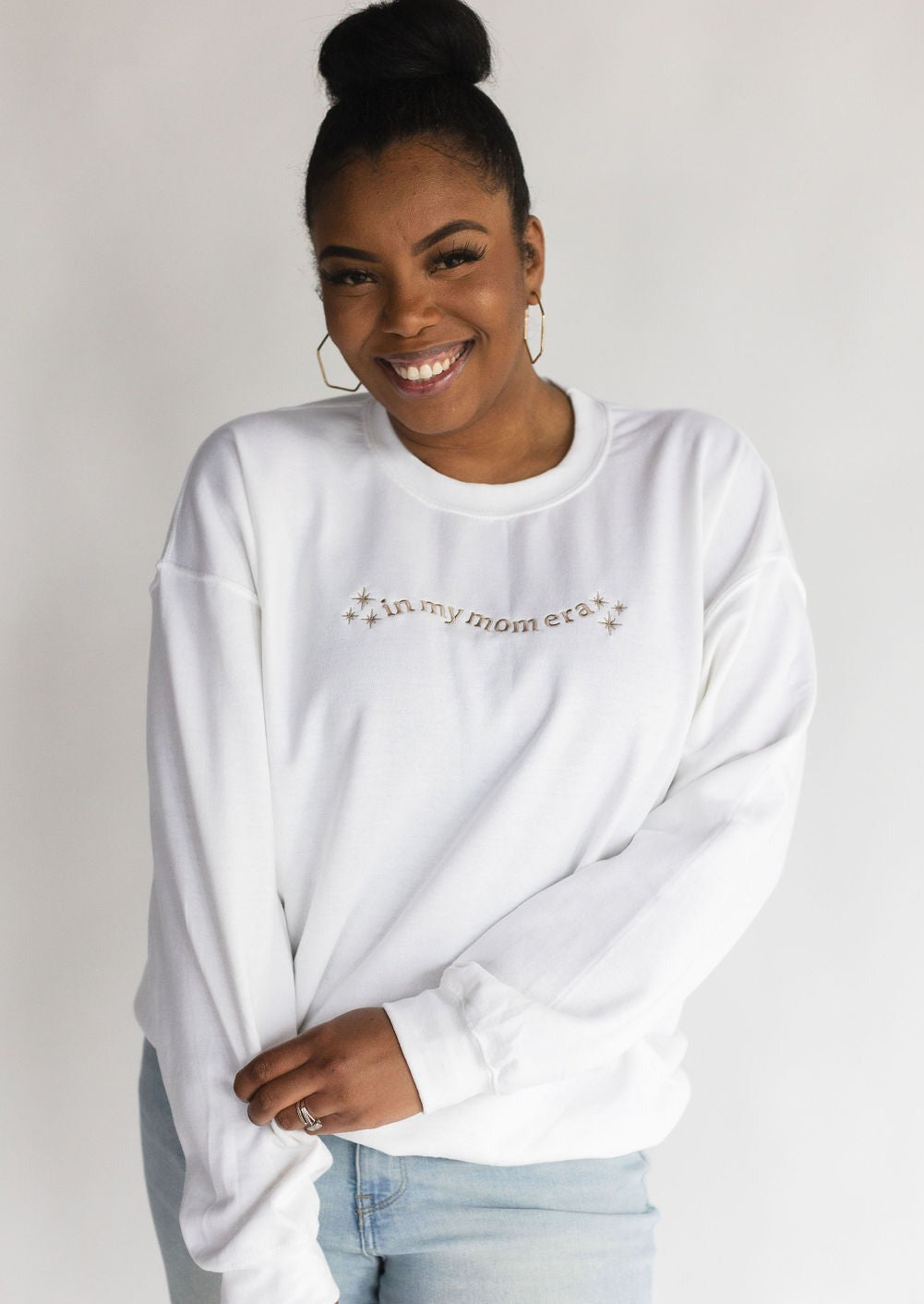 Our favorite In My Mama Era sweatshirt is perfect for Mother's Day! This Christian crewneck is perfect to wear to the gym, while you're running errands, or on Sunday morning at church. This crewneck has a unisex fit and with a loose and relaxed style, and is white with brown stitching.