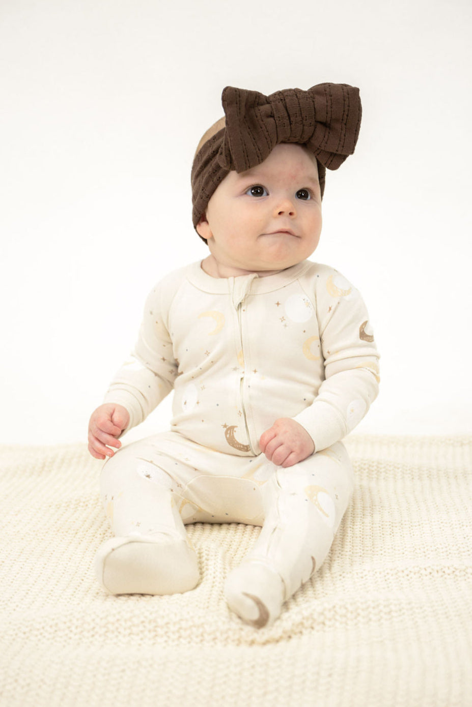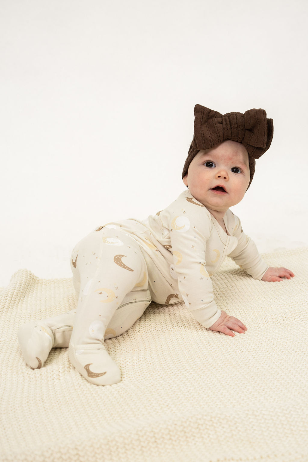 A beautifully crafted footie designed to grow with your little one. It features convertible feet for added breathability, easier movement, or simply to accommodate growth spurts. The two-way zipper makes changes quick and hassle-free. Sizes newborn to 3–6 months include integrated mitts with a high-contrast pattern to support early brain and eye development. For sizes 6–24 months, gripper soles help steady those first steps. Made from a luxuriously soft blend of 70% bamboo viscose and 30% organic cotton, this footie is designed with durability in mind — perfect for passing down. Machine wash on low or delicate; tumble dry low or line dry.