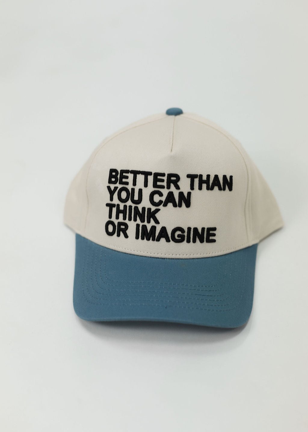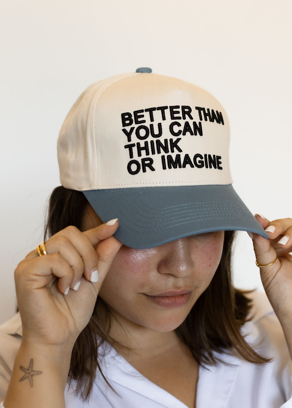 This embroidered "Better Than You Can Think or Imagine" snapback trucker hat is more than just a hat. It's a reminder that God's plan for your life is more than you know. Perfect for any occasion: wear it to a baseball game or while you're running errands, all while reminding others to focus on Jesus. One size fits all.
