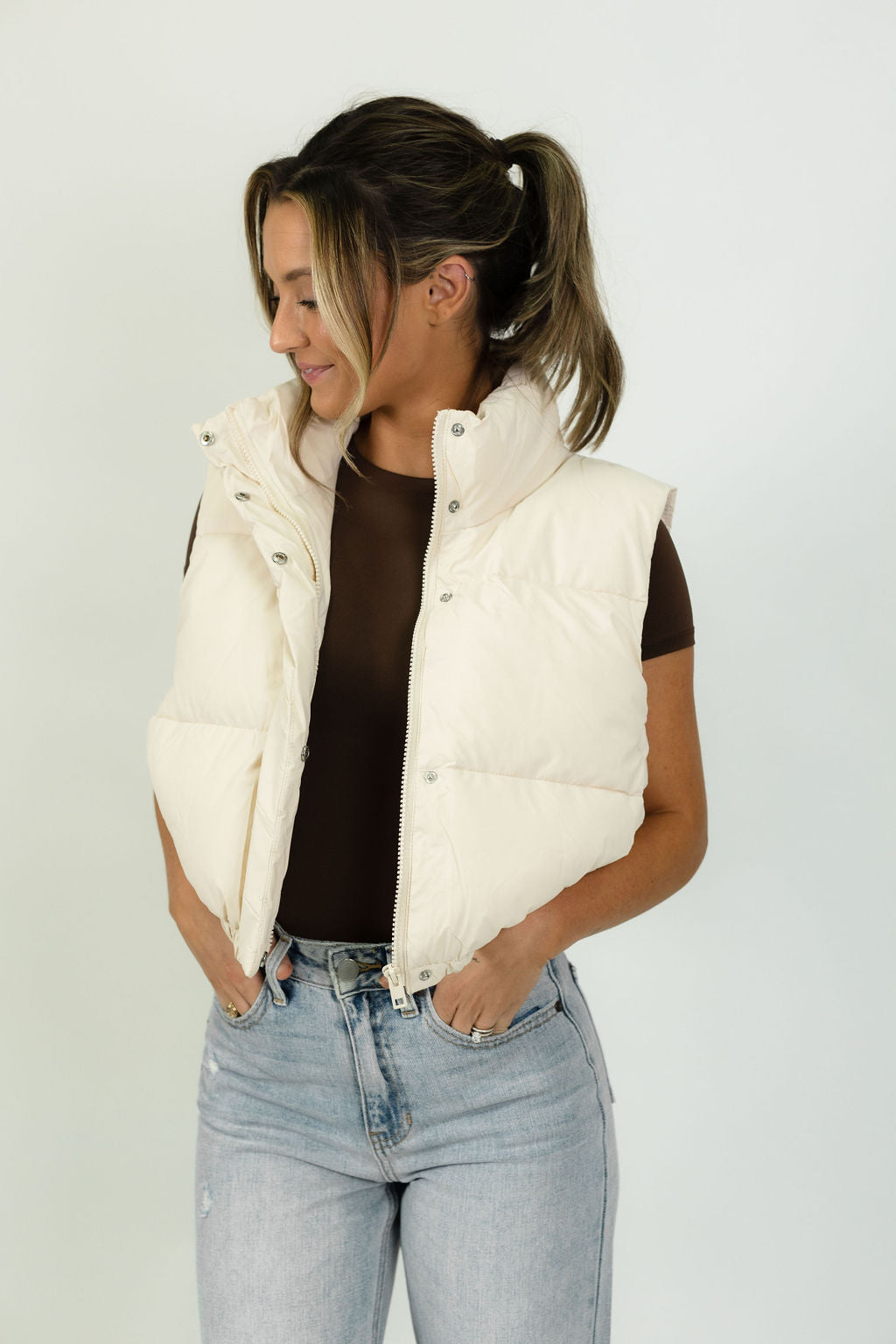 Our Haven Puffer Vest is for the girl who likes to be cozy on chilly days. Dress it up with a pair of jeans or dress it down with your favorite leggings. Our model is pictured wearing a size small.