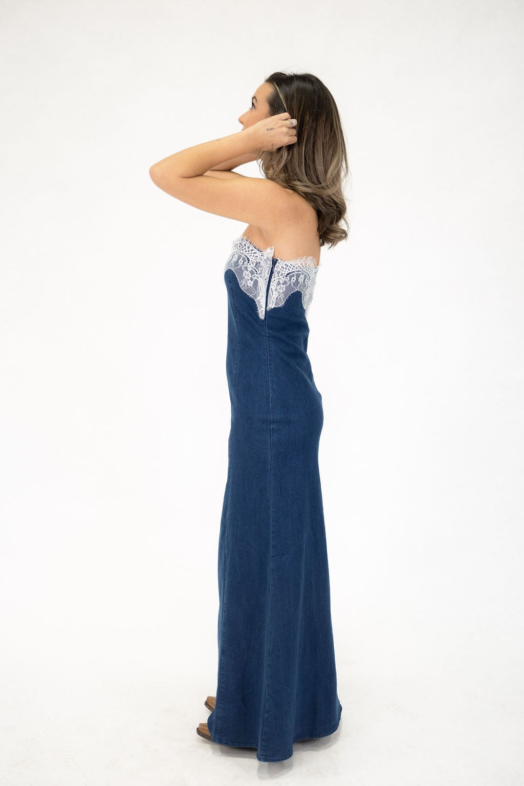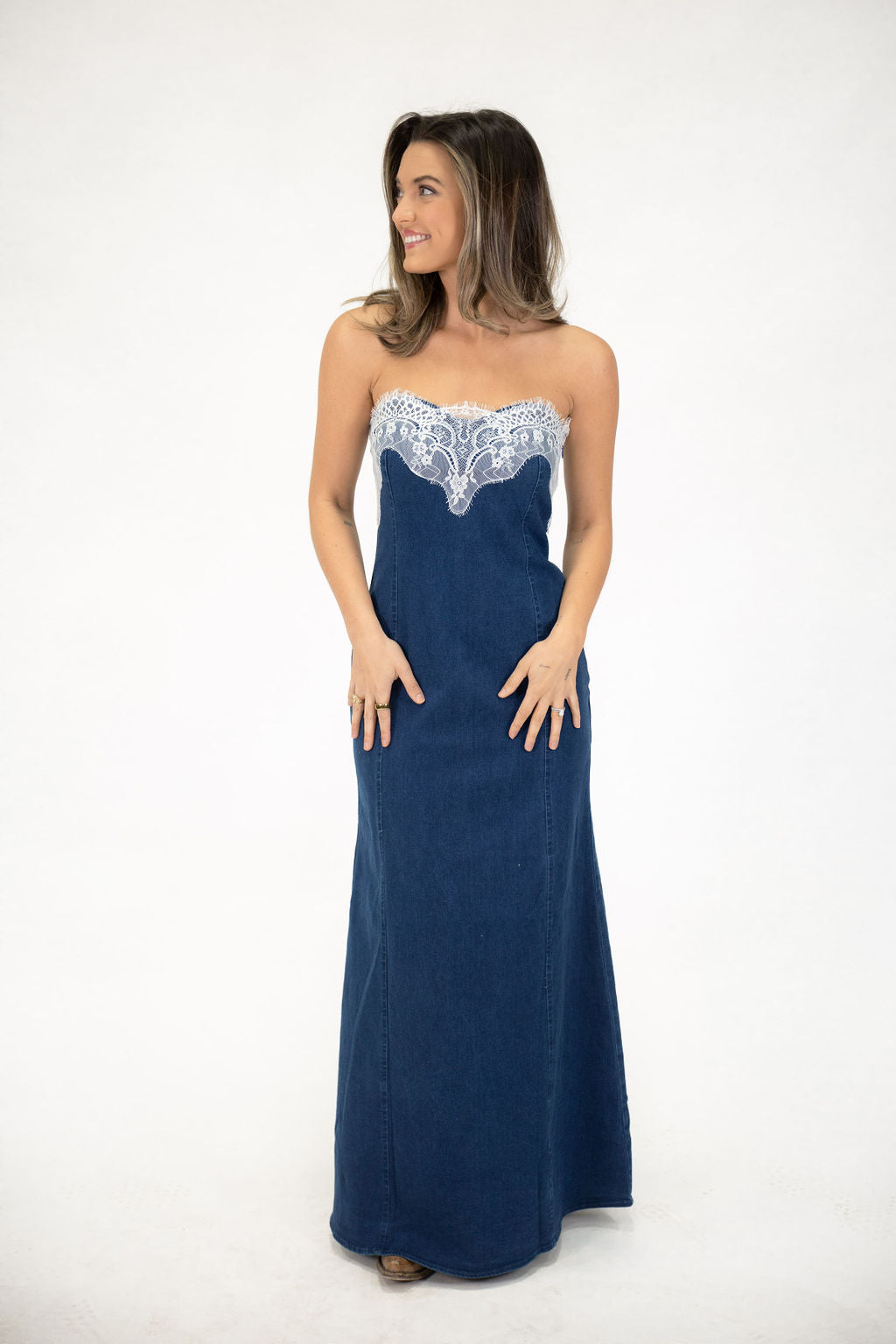 Feminine charm meets Western edge in the Prairie Rose Denim Maxi Dress. Crafted from soft, stretch denim for a flattering fit, this strapless tube dress hugs your curves while keeping you comfortable. Delicate lace detailing adds a touch of romance, making it perfect for the cowgirl who loves a little grace with her grit. Whether you're dancing under the stars or strolling through a country fair, this maxi dress is made for bold, beautiful moments.