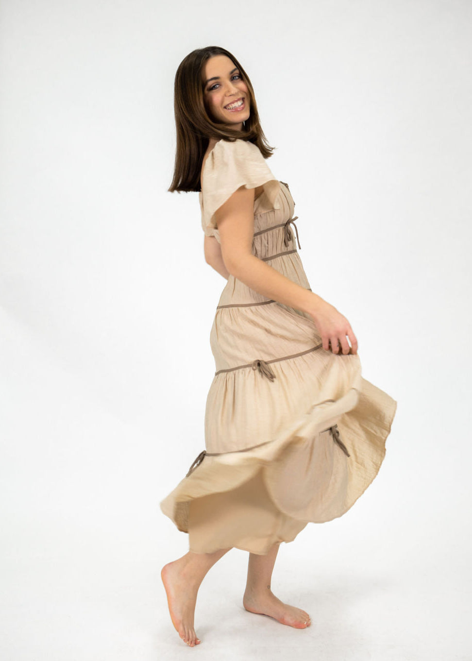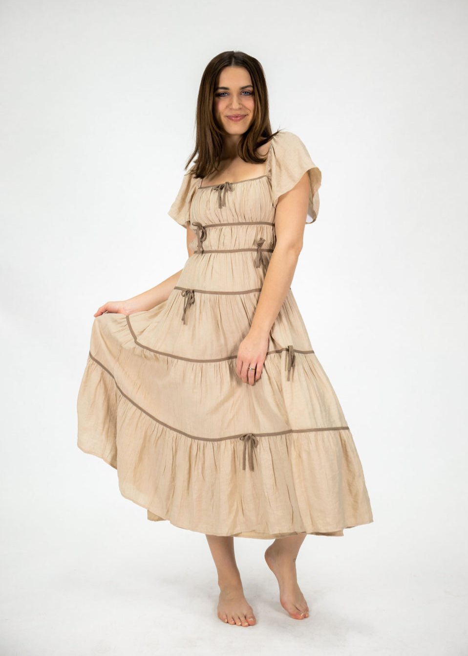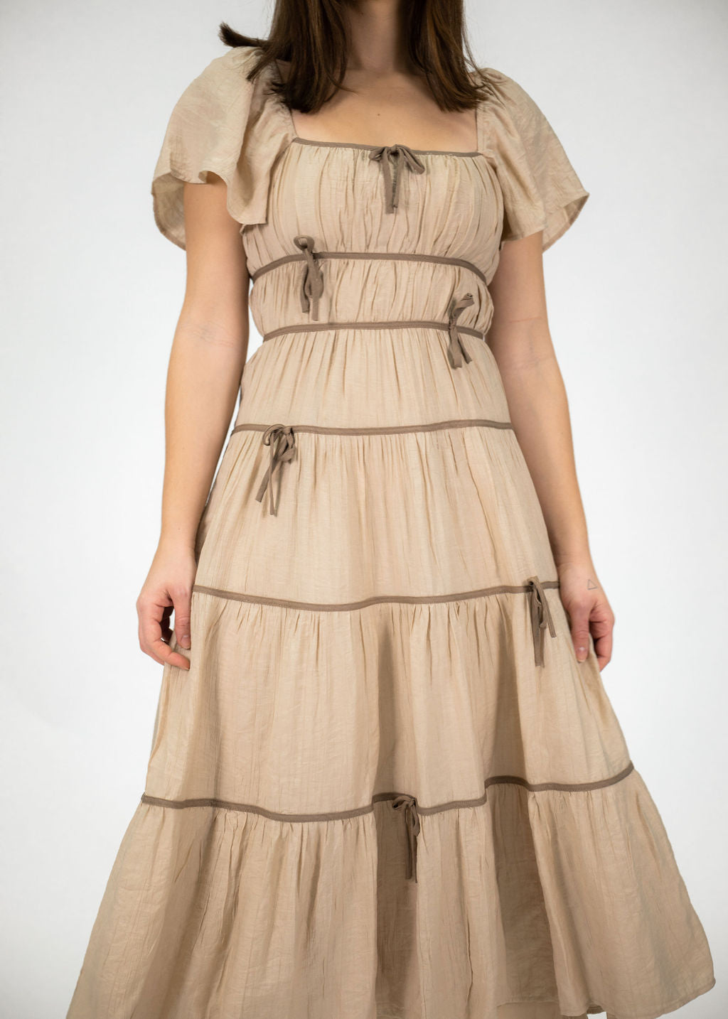 Our Blessing Midi Dress has a feminine, modest twist. It features a square neckline, short flutter sleeves, and a back invisible zipper with delicate bows throughout the dress. Our model is pictured wearing a size small.