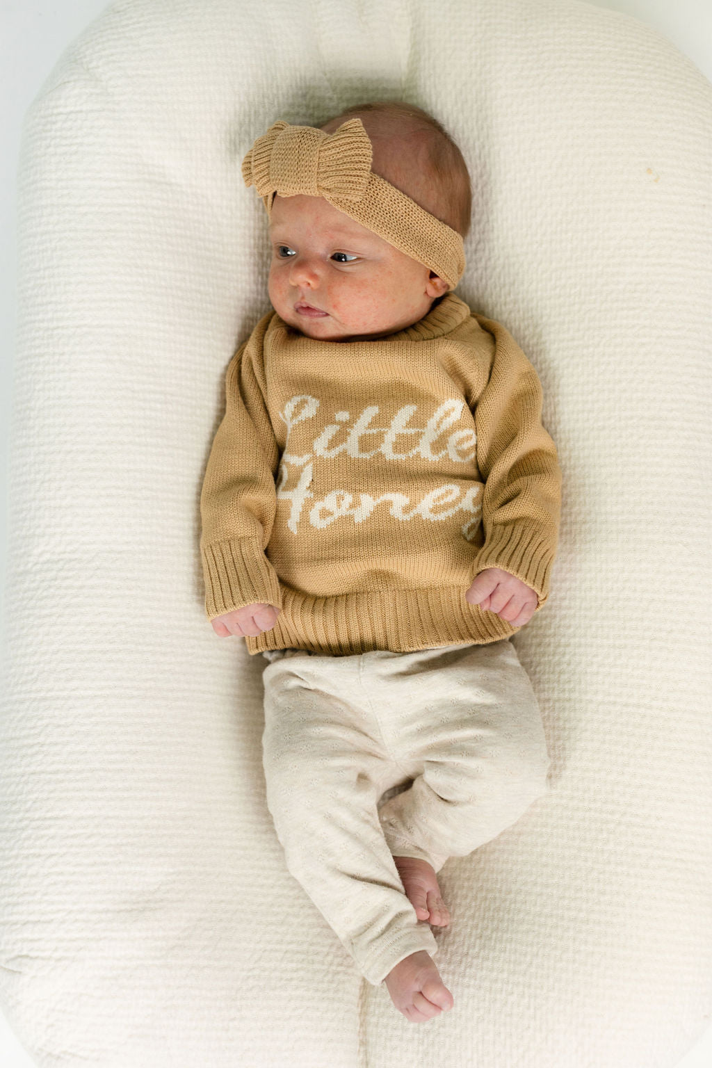 Announce to the world that your little one is here! Our Little Honey Newborn Sweater is the first outfit you've been looking for for your baby on the way. Available in Newborn + 0-3 Month sizes, made with 100% cotton. Pair with our matching Little Honey headband or beanie and booties.