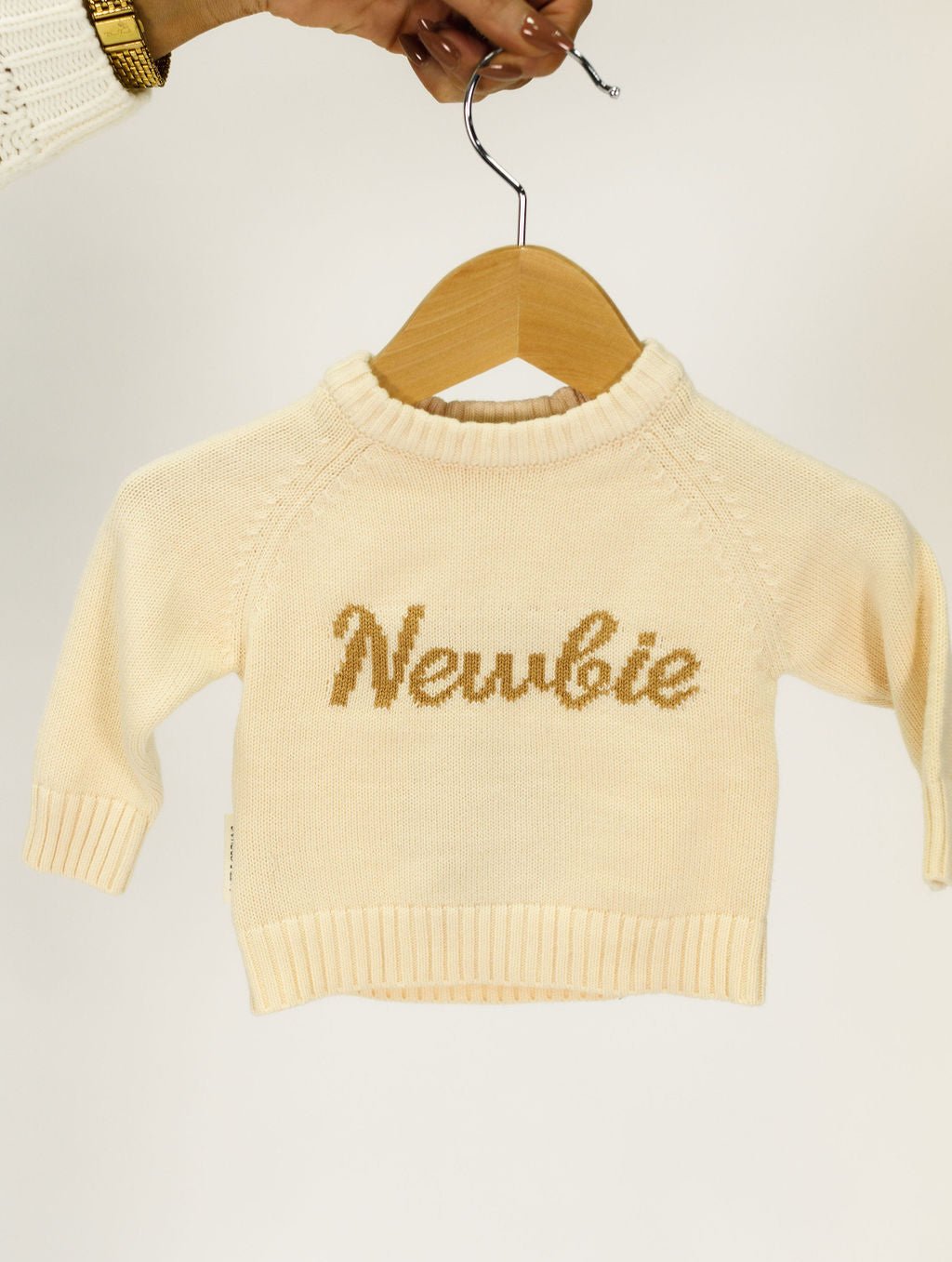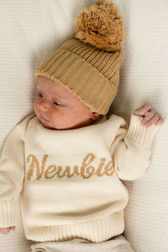 Announce to the world that your little one is here! Our Newbie Newborn Sweater is the first outfit you've been looking for for your baby on the way. Available in Newborn + 0-3 Month sizes, made with 100% cotton. Pair with our matching Coco headband, Coco beanie, and Coco booties.