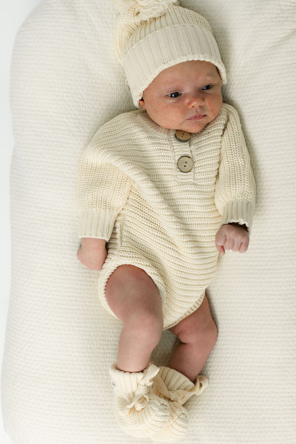 Announce to the world that your little one is here! Our Heavenly Love Newborn Knit Bodysuit is the first outfit you've been looking for for your baby on the way. Available in Newborn + 0-3 Month sizes, made with 100% cotton. Pair with our matching Heavenly Love headband or beanie and booties.