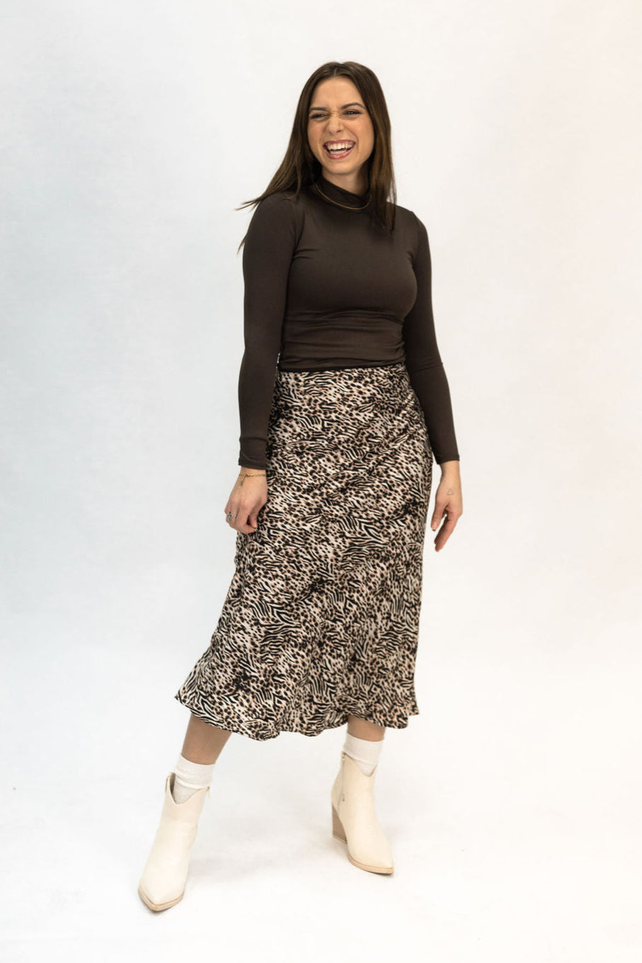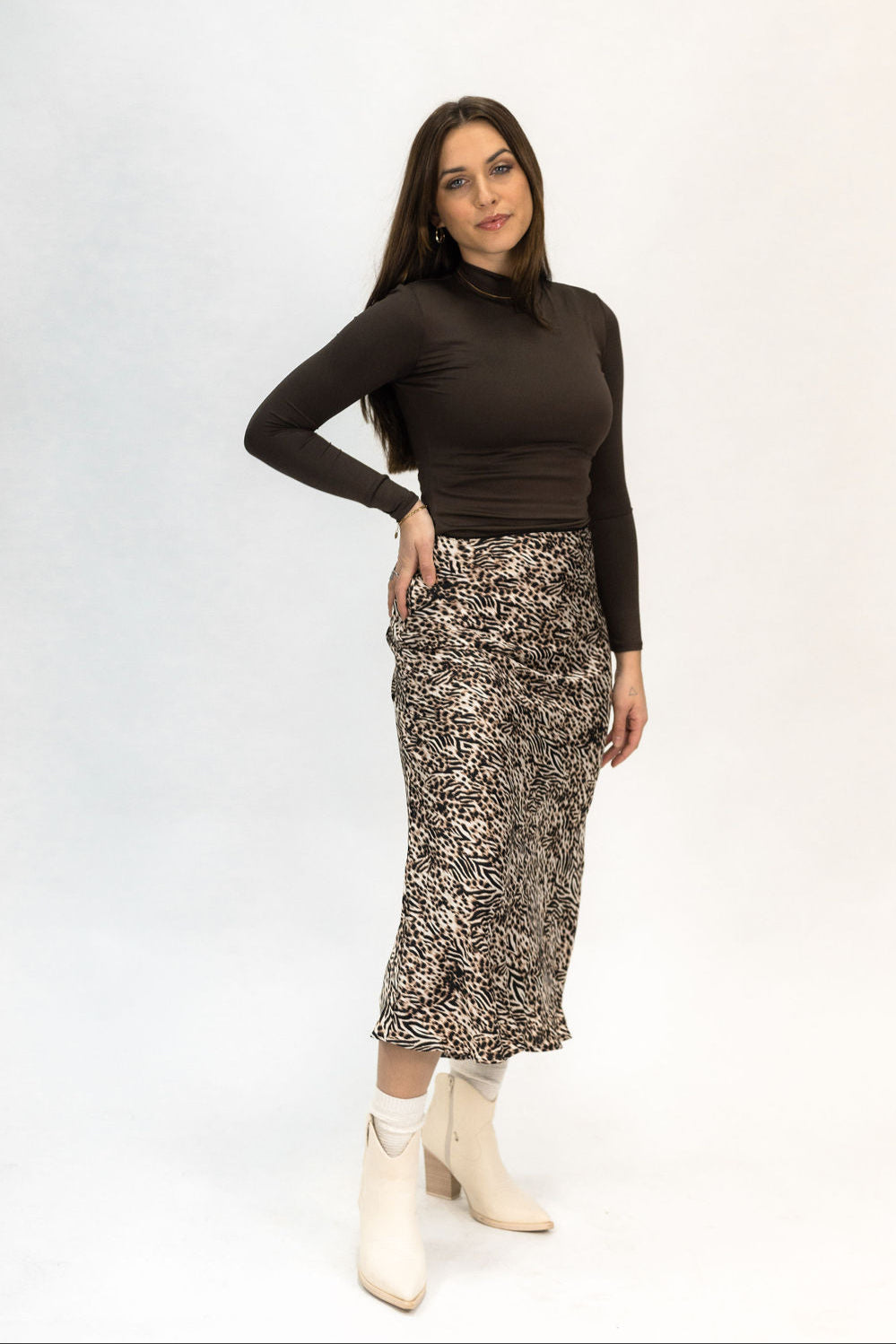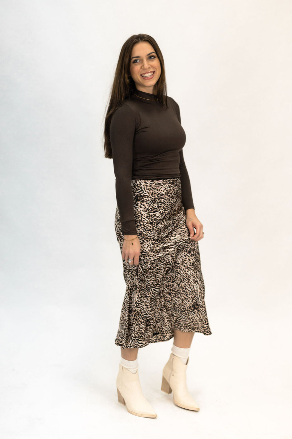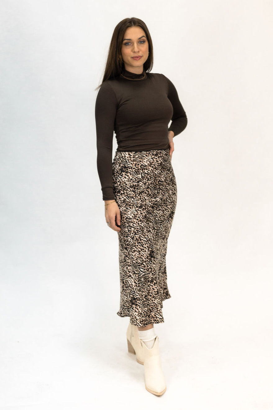 Our Leopard Midi Skirt is the perfect staple piece for your closet. Dress it up with boots or dress it down with sneakers. Our model is wearing a size small and this skirt runs true to size.