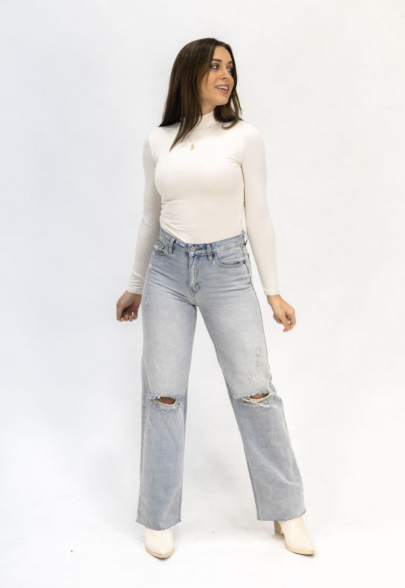 Our light beige classic bodysuit is perfect for any occasion and comes in multiple colors. This bodysuit features a high neckline and long sleeves. All bodysuits are final sale.
