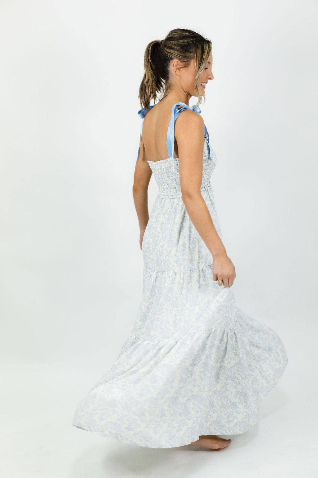This dress is all about the details! Adjustable ribbon sleeves that fall gently on the shoulder to offer support and style. The dress is a maxi length and is perfect for any season! Our models are pictured wearing a size large and small.