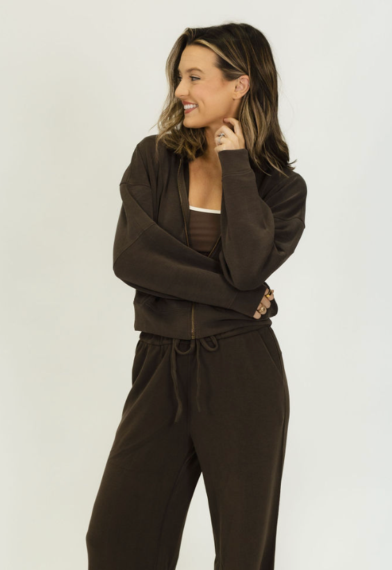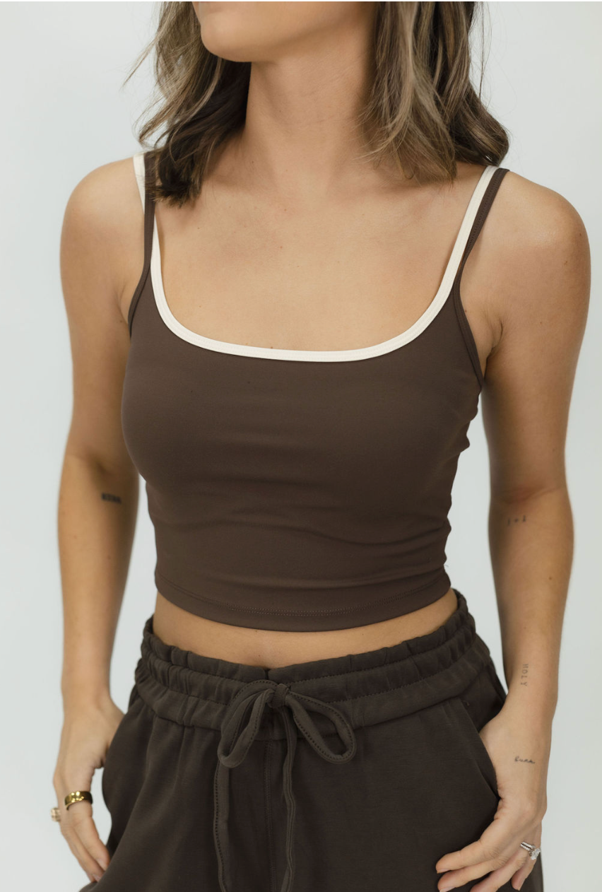 Our Two Tone Remi Top highlights a chocolate brown and ivory border on this comfy cami. This is the perfect piece for layering with our other Hazel and Layne items from our Brown Hues collection. Our model is wearing a size small.