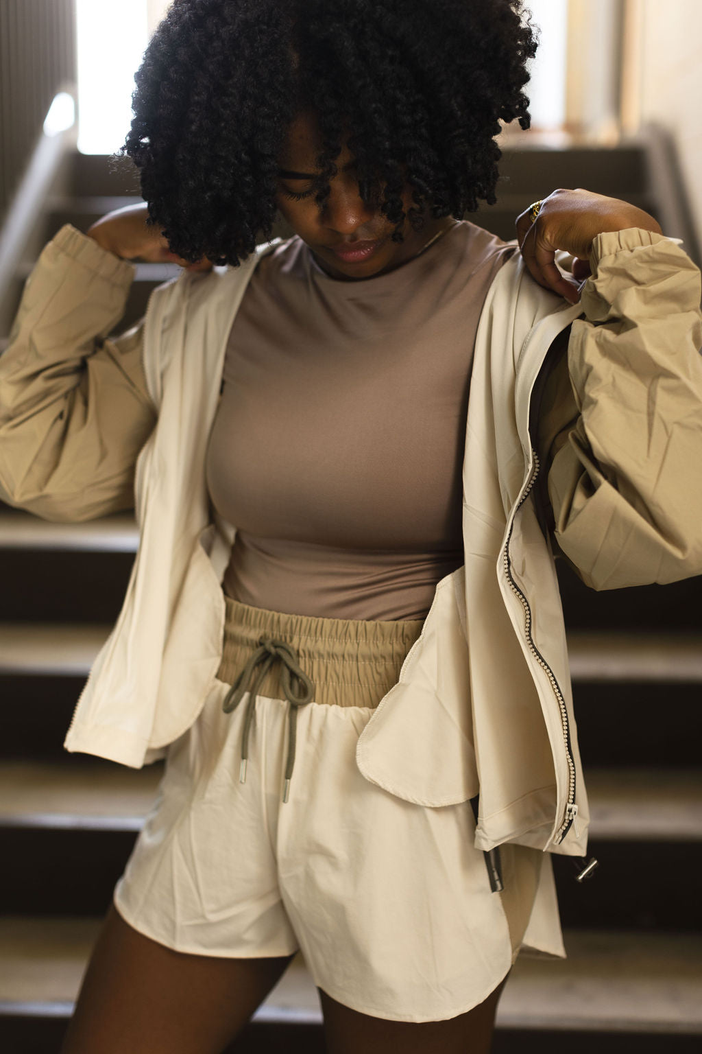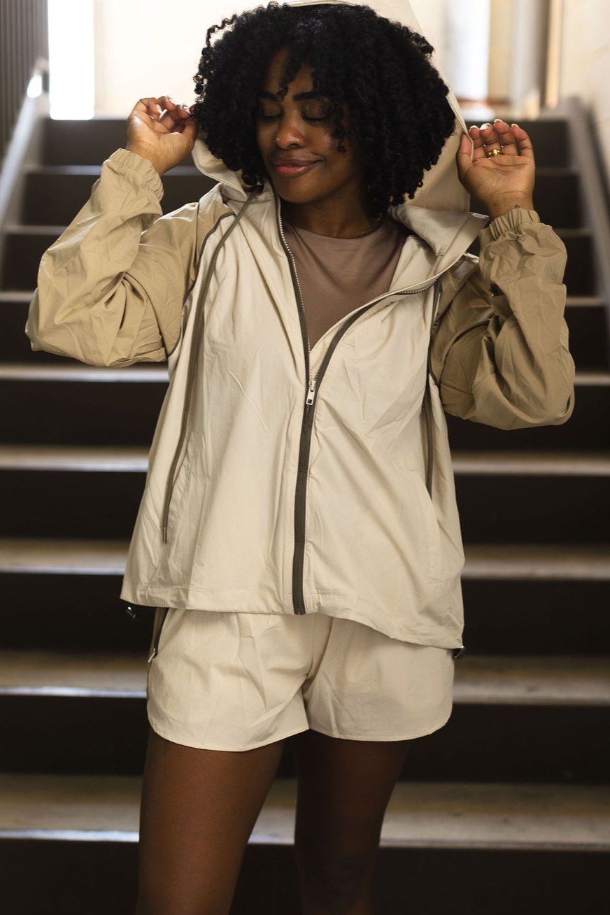 Our Anna Color Block Windbreaker has drawstrings and a zip up fit. Pair this with our matching Anna Color Block Shorts for the gym or out to run errands. Our model is pictured wearing a size medium.